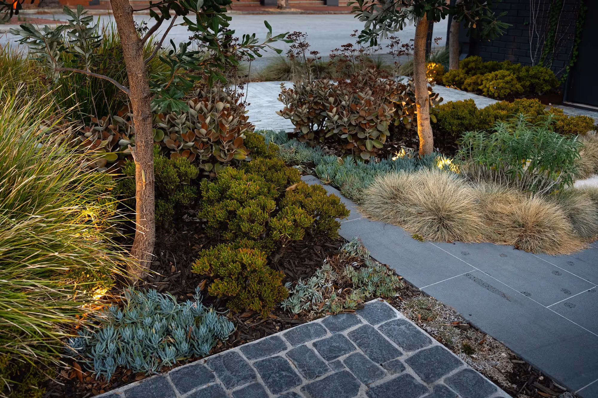 Set atop a challenging site, extensive soil preparation was essential to lay the groundwork. We provided a turnkey solution - installing all reticulation, lighting, hardscape groundwork, and detailed stonework bringing the showroom to life. The extensive stone work was executed in collaboration with Marvel Tile and Stone, LA Stonework, and Darren Stone, ensuring top-tier craftsmanship.