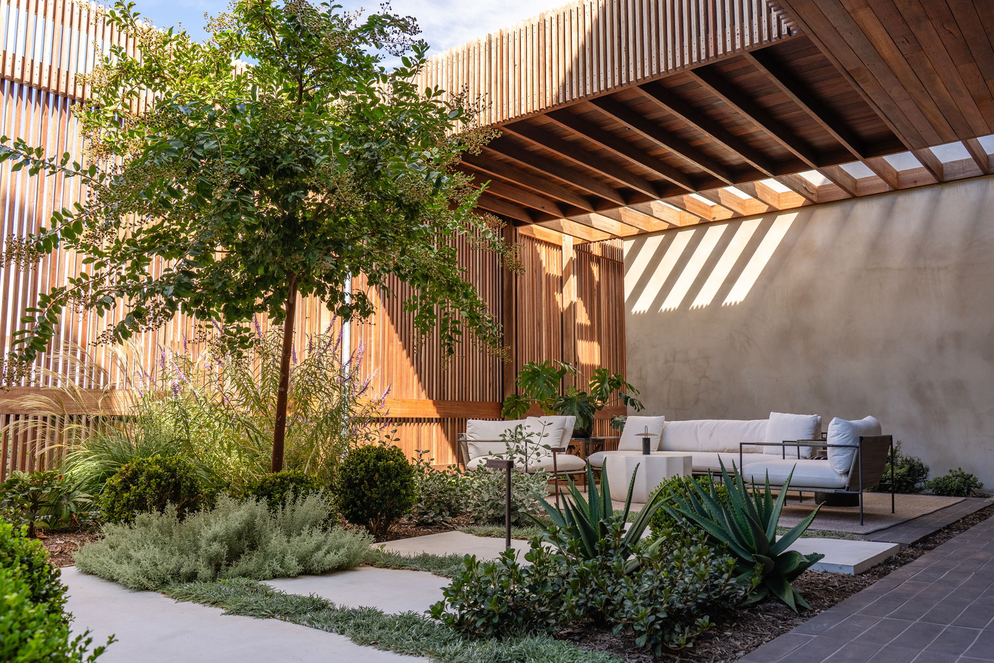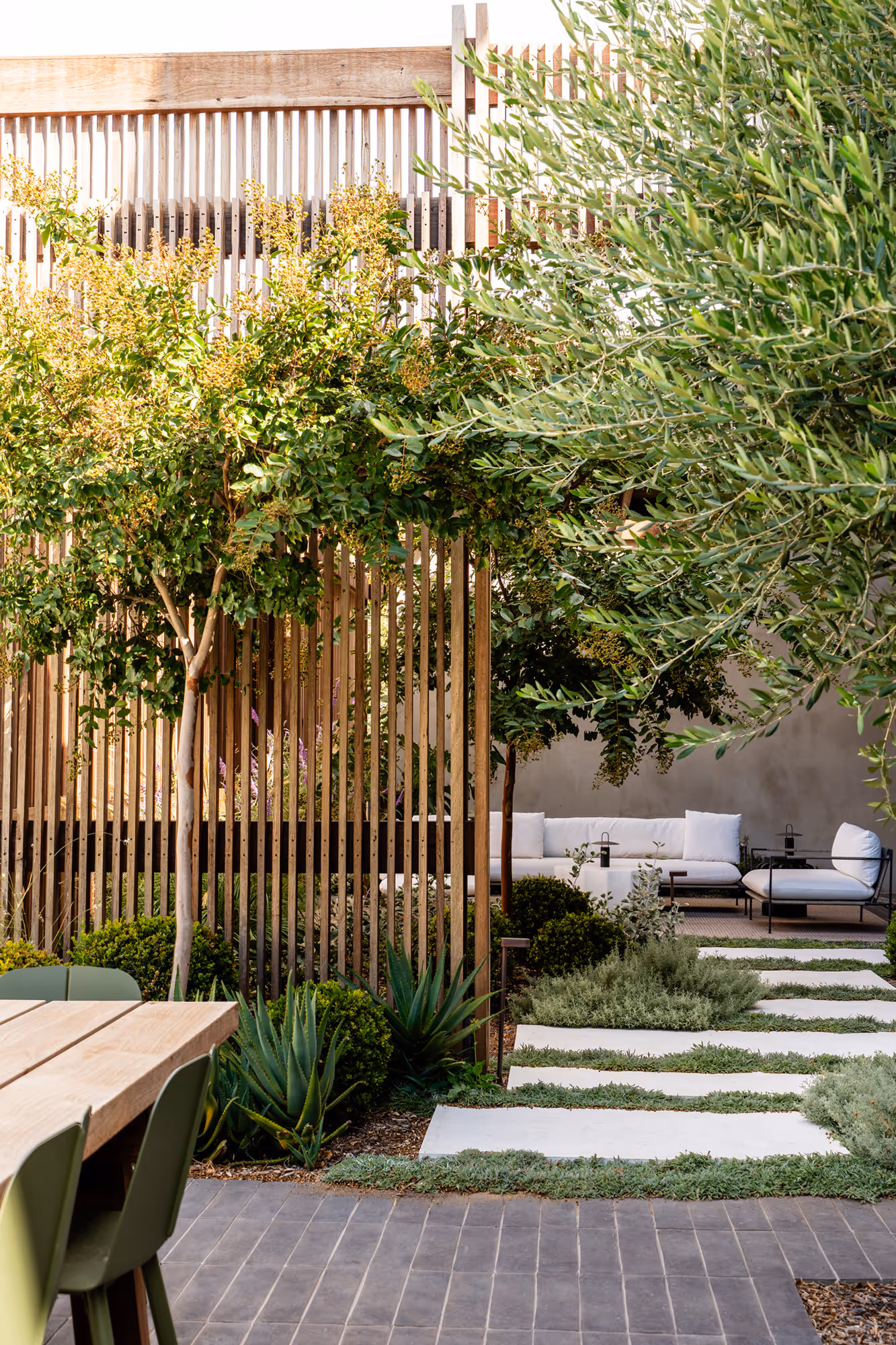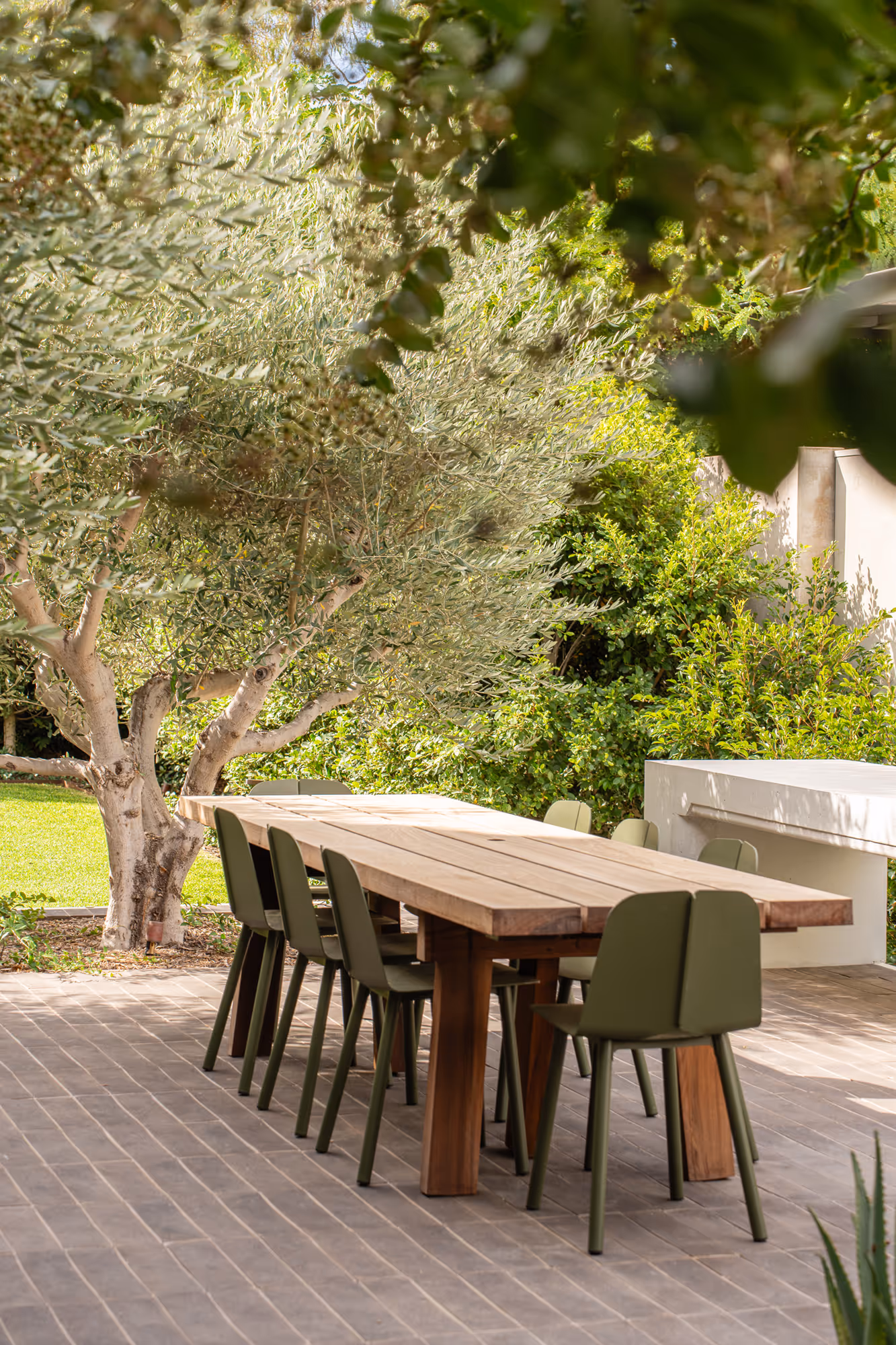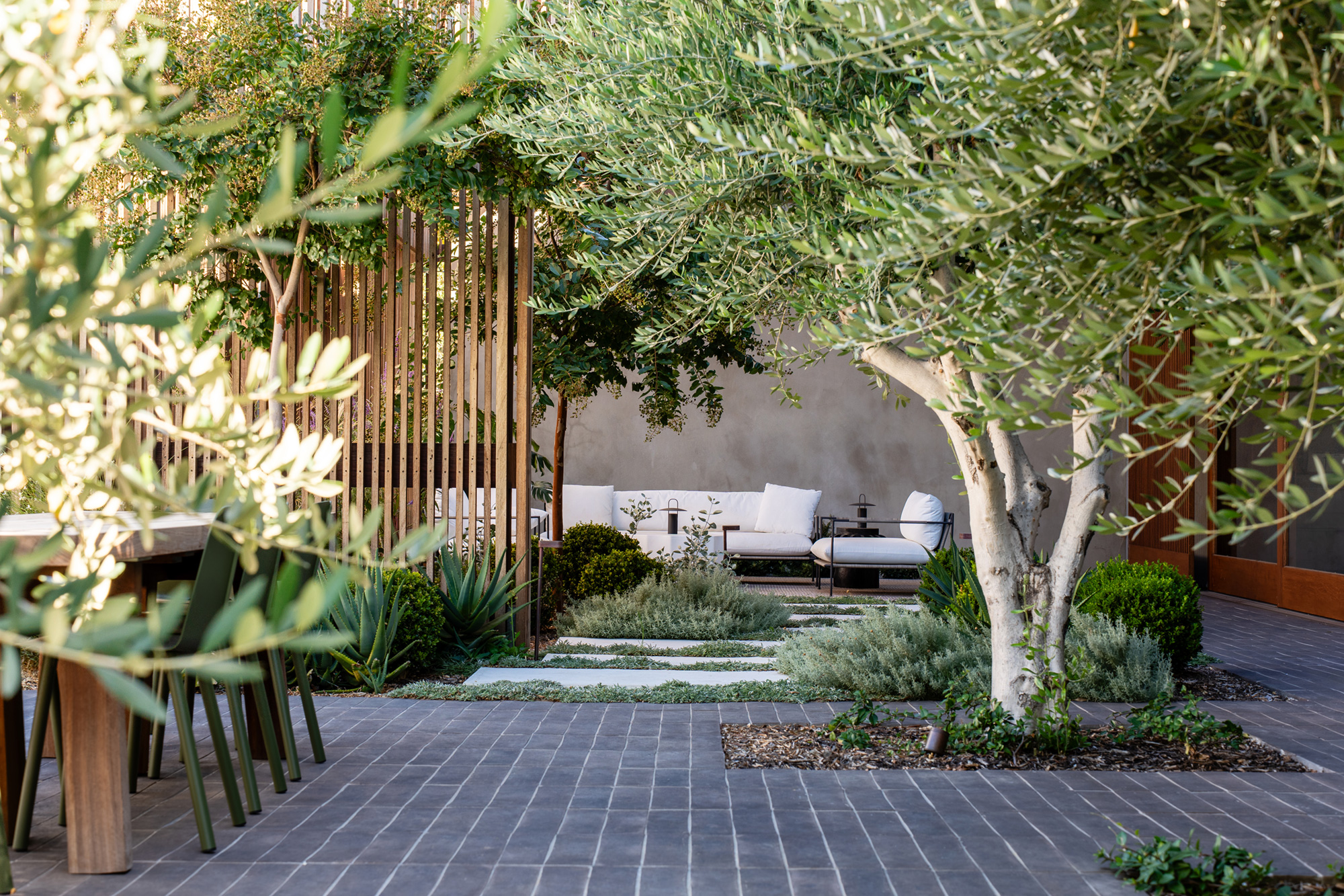 The approach was intentionally restrained, with a carefully curated plant palette proving that less can indeed be more. In the rear garden, a large established hedge was preserved, providing structure and privacy while anchoring the new planting scheme. An olive grove of mature, transplanted trees forms the heart of the front entertaining area, bringing a sense of permanence and Mediterranean charm.
