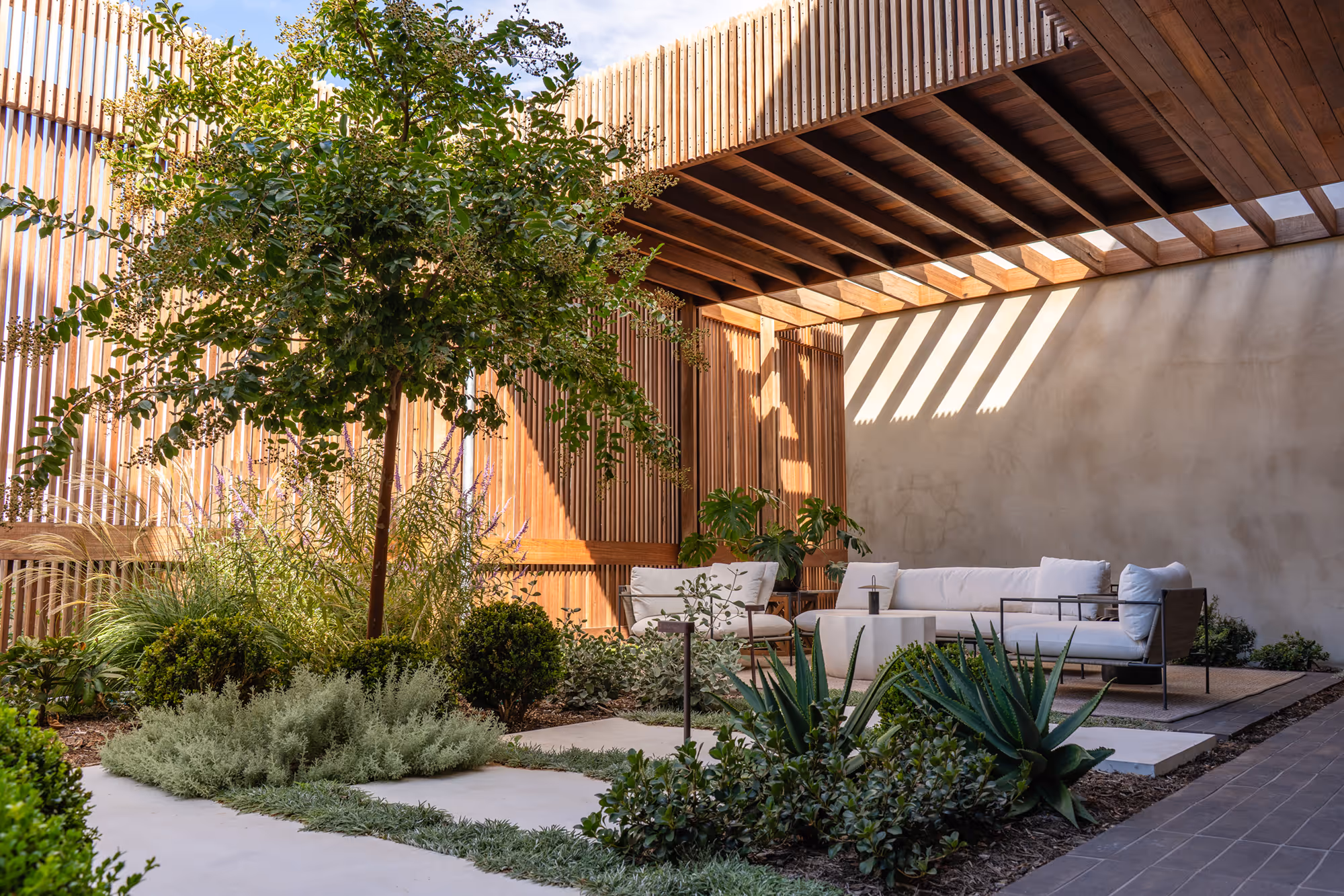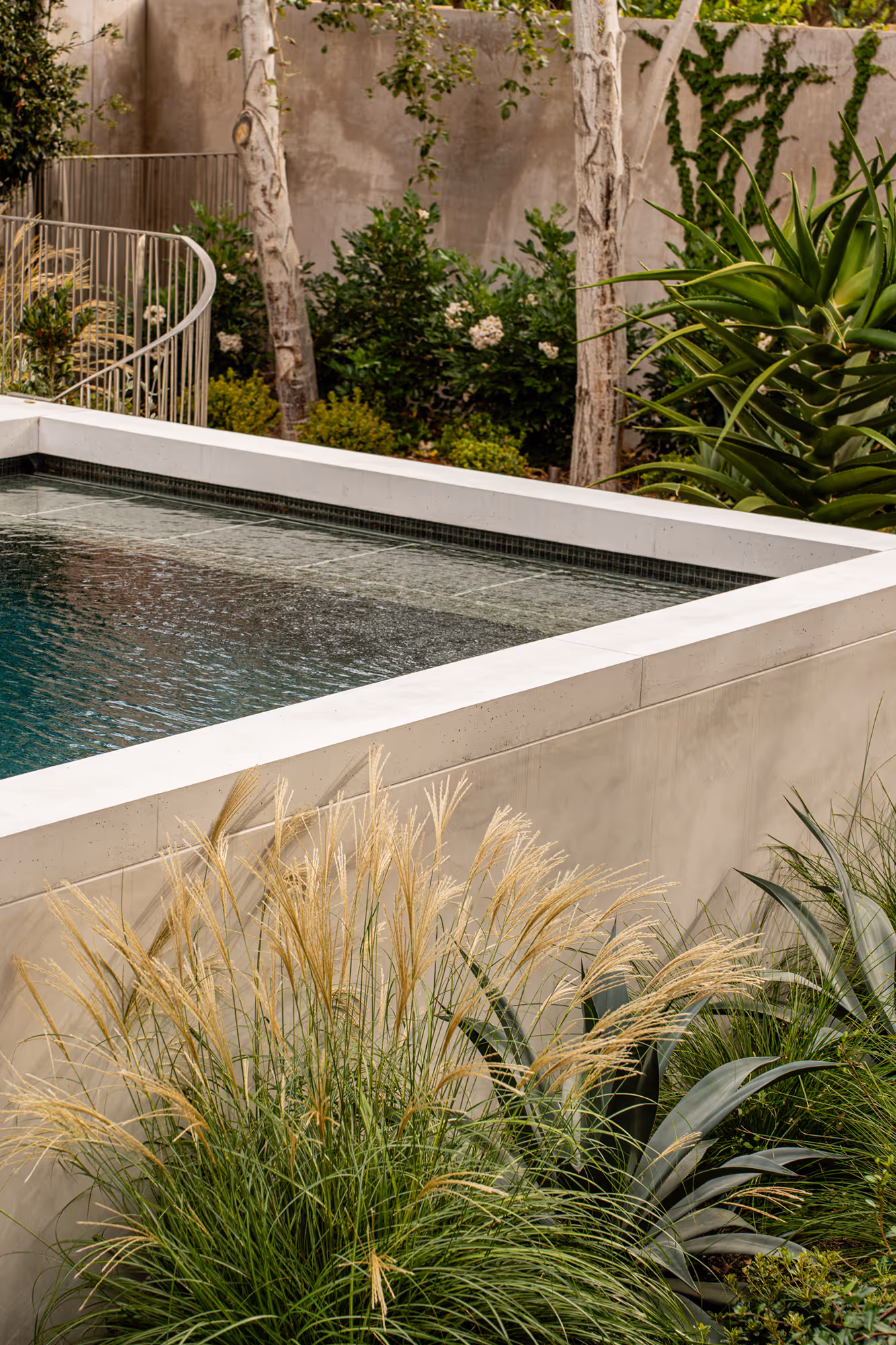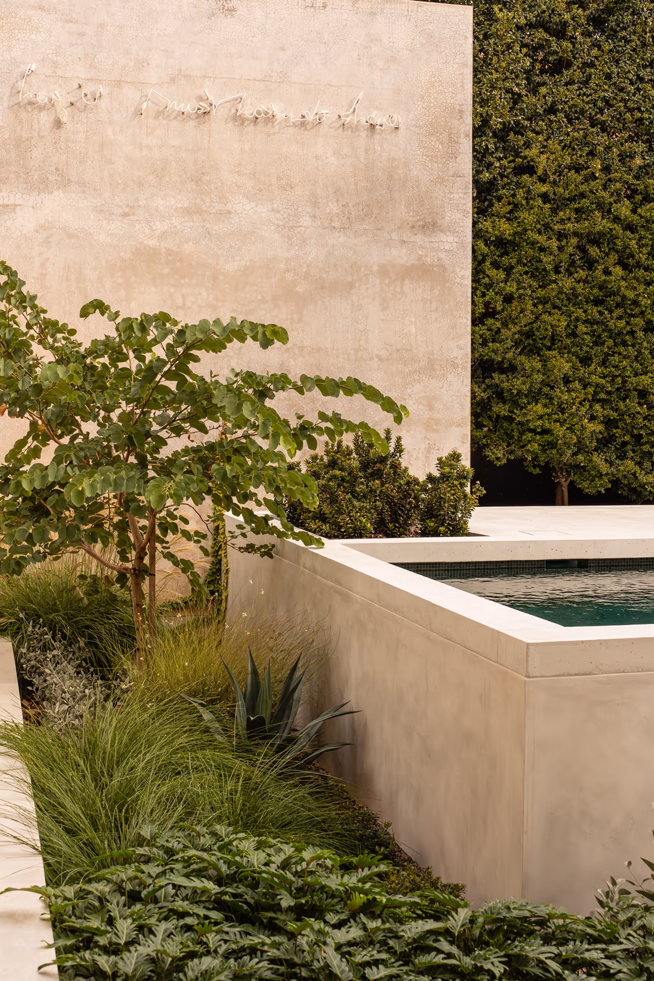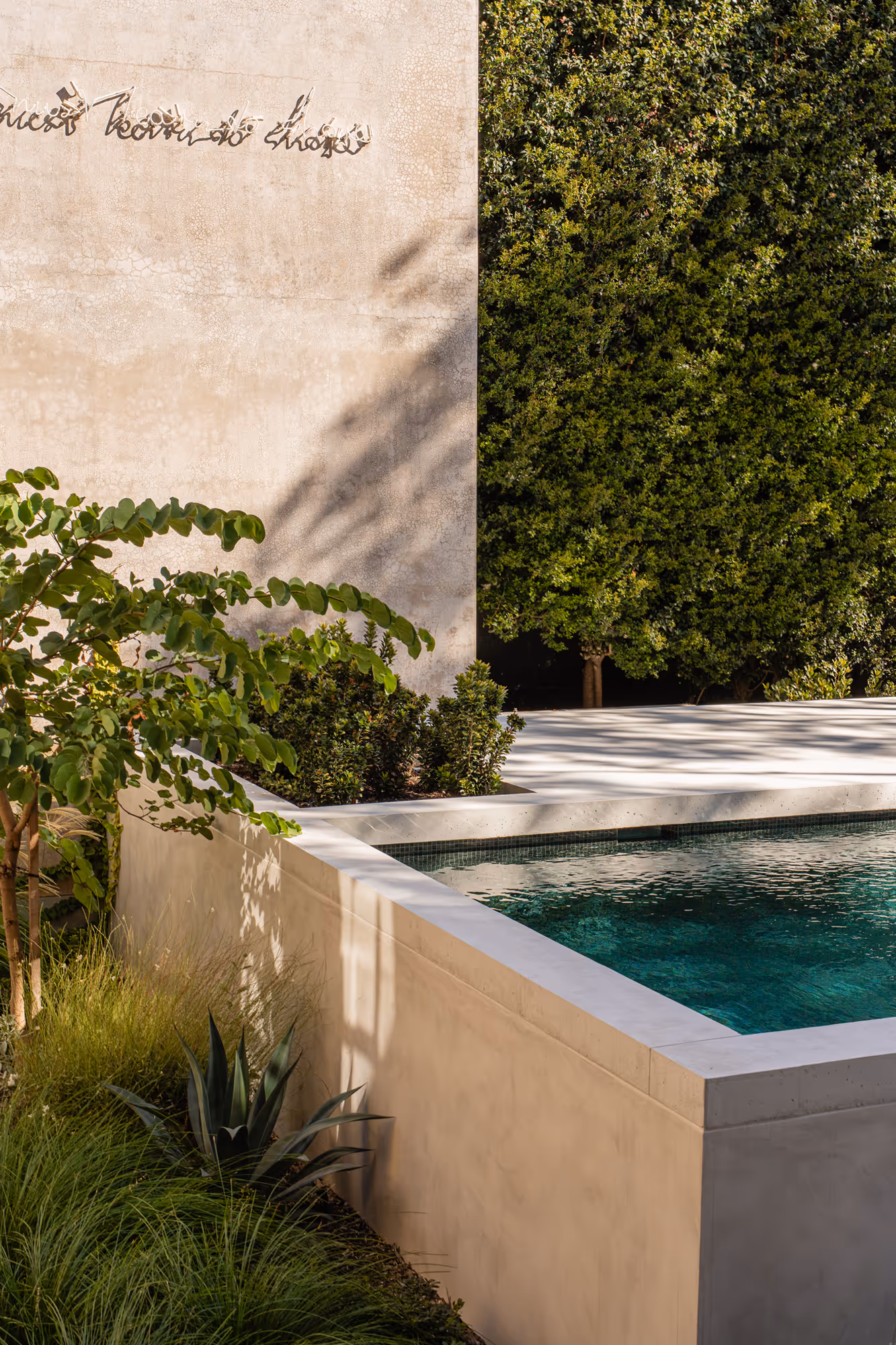 The approach was intentionally restrained, with a carefully curated plant palette proving that less can indeed be more. In the rear garden, a large established hedge was preserved, providing structure and privacy while anchoring the new planting scheme. An olive grove of mature, transplanted trees forms the heart of the front entertaining area, bringing a sense of permanence and Mediterranean charm.